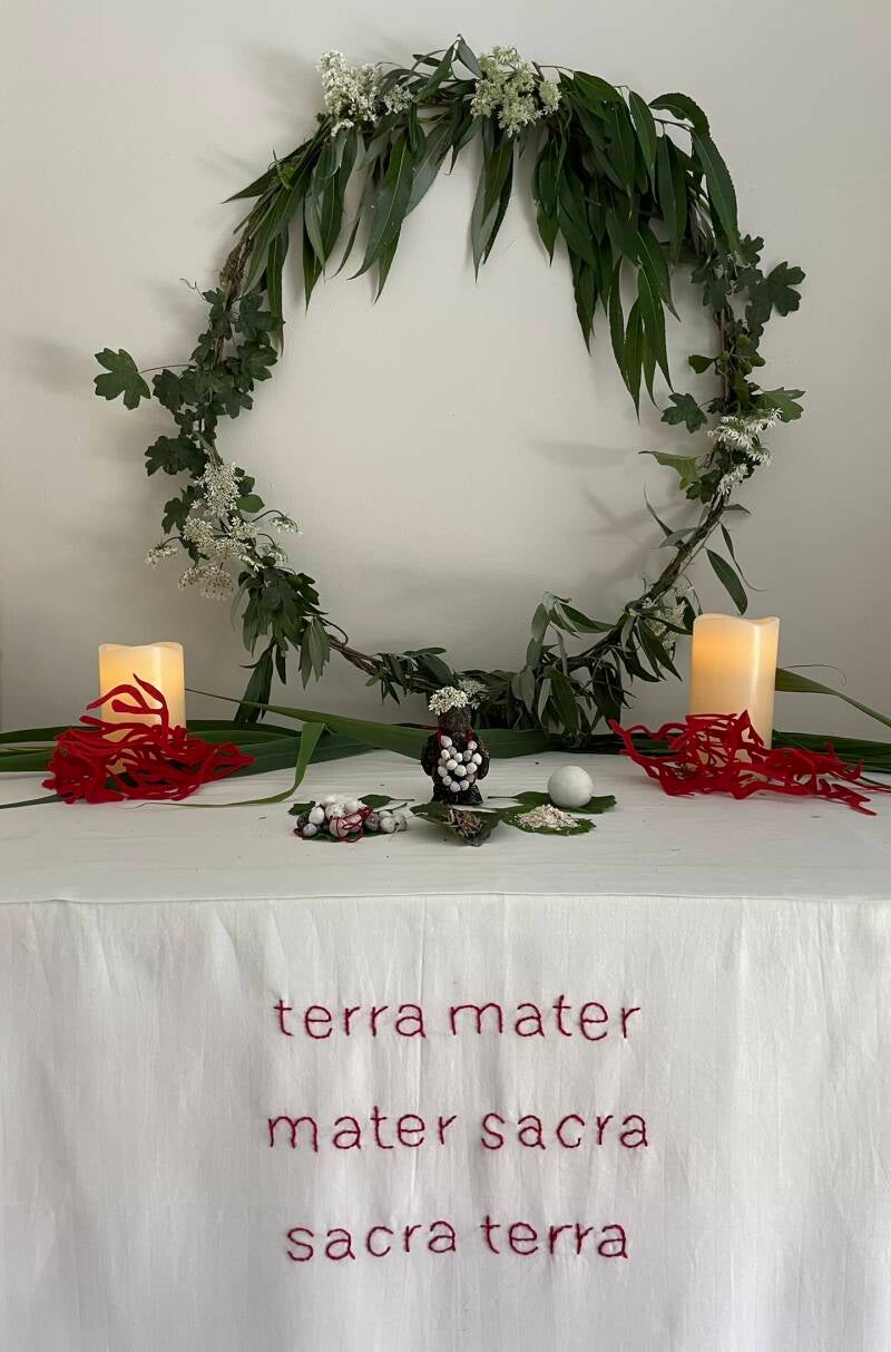 Altar with reredos of natural wild plants and flowers, offerings placed on alder leaves, cut red felt evoking the intimate bond between femininity and blood, candles, sedge and clay terra mater figure.